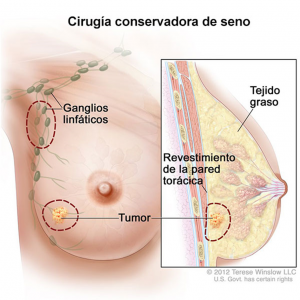 La cirugía conservadora de seno significa que el cirujano extirpa solo el CDIS o solo el cáncer y algo de tejido normal del derredor. Si usted tiene cáncer, el cirujano extirpará también uno o dos ganglios linfáticos de abajo de su brazo. La cirugía conservadora de seno deja su seno prácticamente como se veía antes de la cirugía. Las otras palabras que significan lo mismo que cirugía conservadora de seno son: